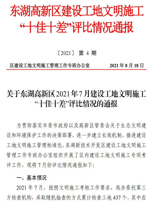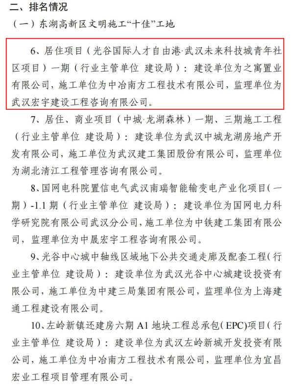 ? 根據(jù)東湖新技術(shù)開發(fā)區(qū)建設(shè)工地文明施工管理工作專班辦公室組織開展的區(qū)內(nèi)建設(shè)工地文明施工專項(xiàng)考評,之寓未來(武漢未來科技城青年社區(qū))項(xiàng)目被評為2021年7月東湖高新區(qū)文明施工“十佳”工地。