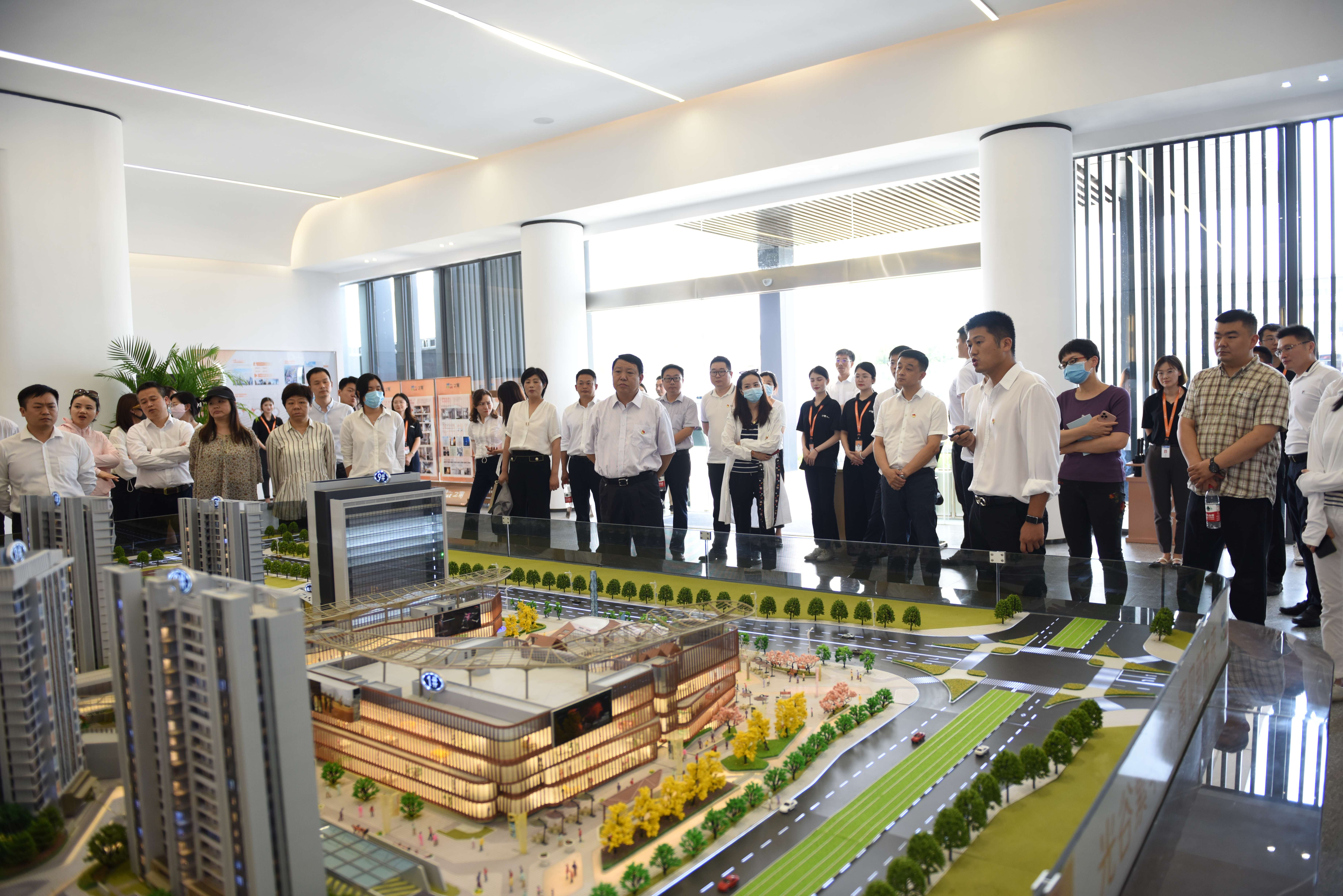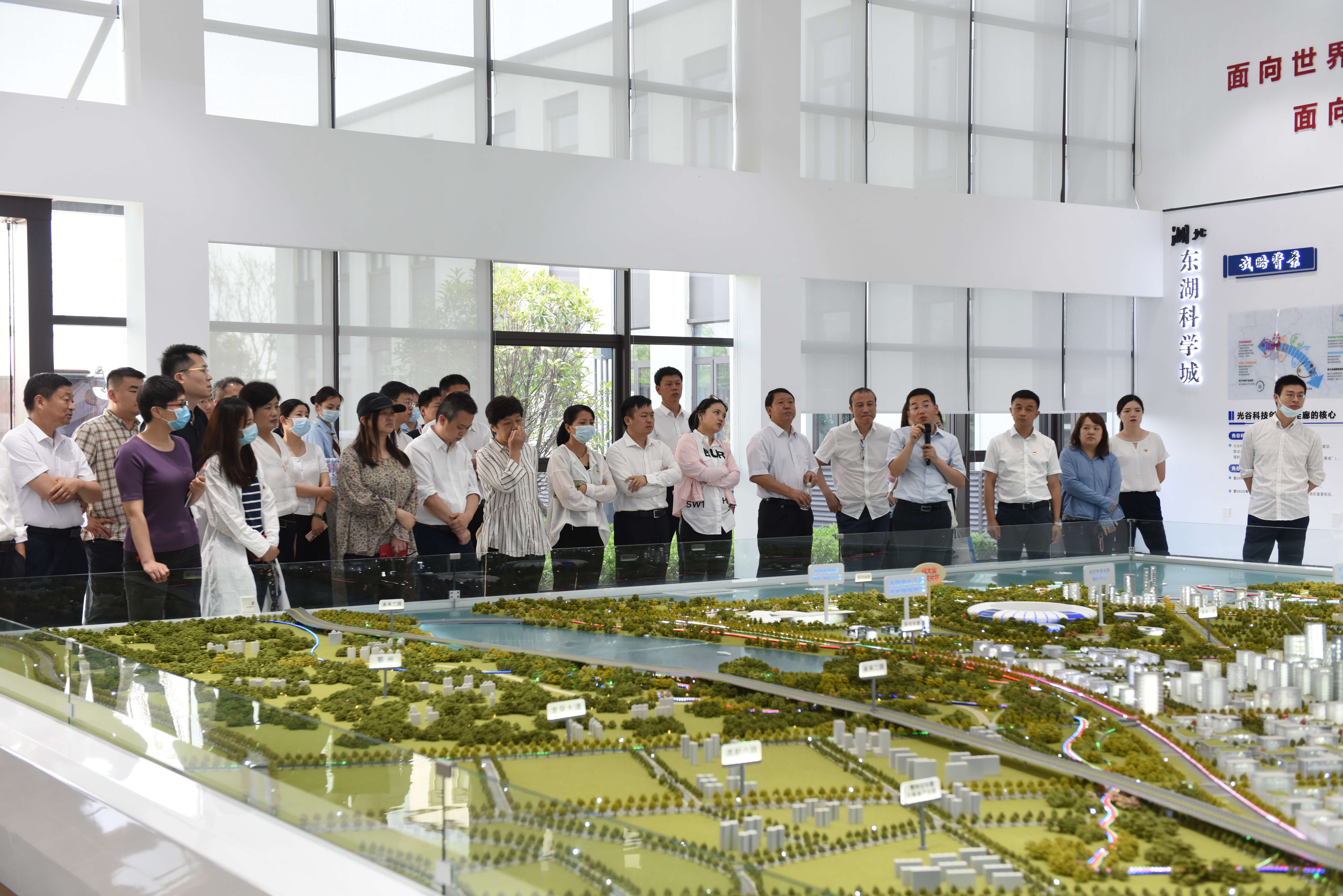 參觀現(xiàn)場,產(chǎn)業(yè)園公司總經(jīng)理王樂介紹了創(chuàng)新園二期及海洋院項(xiàng)目基本情況與施工進(jìn)度,創(chuàng)新園二期項(xiàng)目商業(yè)配套、多層研發(fā)、展示中心及獨(dú)棟多層廠房已封頂;海洋院項(xiàng)目已進(jìn)入裝修部分收尾階段,預(yù)計(jì)8月項(xiàng)目全部完工交付使用。光谷置業(yè)公司總經(jīng)理祁佺向大家介紹了之寓未來項(xiàng)目的開工進(jìn)展情況,并展示了之寓未來項(xiàng)目樣板間,該項(xiàng)目建設(shè)除去疫情僅13個(gè)月達(dá)到精裝入住標(biāo)準(zhǔn),一期首開2-8棟947套1577間,于7月15日入住,剩余8棟2194套將于明年三月交付入住,二期今年7月底開工,2024年整體交付;數(shù)字經(jīng)濟(jì)產(chǎn)業(yè)園項(xiàng)目地下室施工已完成,正在進(jìn)行地上主體結(jié)構(gòu)施工,預(yù)計(jì)2025年12月竣工。隨后汪志忠一行帶領(lǐng)大家前往科學(xué)島展廳及項(xiàng)目指揮部,科投集團(tuán)副總經(jīng)理劉坤對科學(xué)島項(xiàng)目整體規(guī)劃及建設(shè)進(jìn)度做了詳細(xì)介紹,科學(xué)島公司董事長金波對科學(xué)島前期工作和展廳的建設(shè)做了全面介紹,按照管委會對科學(xué)島項(xiàng)目“4.30”任務(wù)節(jié)點(diǎn)相關(guān)工作要求,積極響應(yīng),在保障安全的前提下高效的完成了各項(xiàng)任務(wù)。